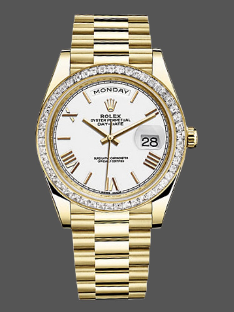 Our 1:1 Rolex Day Date replica watches feature 18k gold or platinum designs with precise dials that perfectly display traditional day and date functions. The automatic mechanism in every watch maintains timekeeping accuracy at the same level as premium original timepieces. Our precise replication method focuses on every detail to deliver a genuine-looking timepiece that feels luxurious when worn on your wrist.