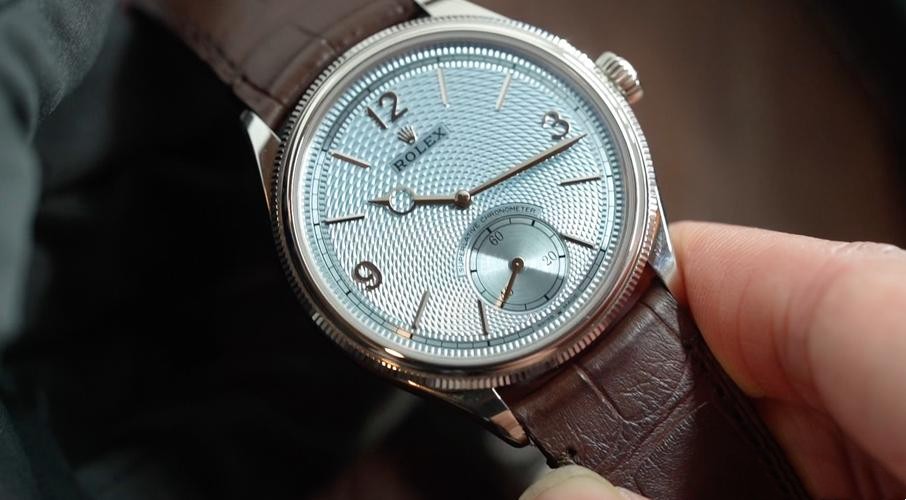 • Close-up of Rolex 1908 52506 showing guilloché ice blue dial and small seconds subdial.