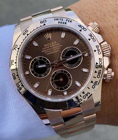 Brand: Rolex Model: Daytona Model Number: m126505 0003 Gender: Men's Case Case Shape: Round Case Diameter: 40 mm Case Finish: Polished Case Material: Rose Gold Bezel: Fixed, with engraved tachymetric scale, in 18 ct Everose gold Winding Crown: Screw-down, Twinlock double waterproofness system Crystal: Scratch Resistant Sapphire Case Back: Solid Dial Dial Color: Bright Chocolate and black Dial Markers: Round Luminous Dial Type: Analog Hands: Luminous Bracelet Band Material: 18k Rose gold Band Name: Oyster, three-piece solid links Clasp: Folding Oysterlock Safety Clasp Movement Movement: Perpetual, mechanical, self-winding Precision: Deviation: Asian (± 30 - 60 sec/day), Swiss (± 15 - 30 sec/day), 1:1 Clone (± 2 - 5 sec/day) Power reserve: Approximately 72 hours Functions: Hours, Minutes, Seconds, Chronograph, Column wheel, Chronometer Oscillator: Syloxi hairspring in silicon with patented geometry. High-performance Paraflex shock absorbers Winding: Bidirectional self-winding via Perpetual rotor Additional Info Water Resistance: Asian:life waterproof, Swiss: 100 meters, 1:1 Clone: 300 m After-sales service Warranty: Asian: 1 Year, Swiss: 2 Years, 1:1 Clone: 5 Years Return Policy: If you are not satisfied with our product, please return your watch within 30 days for a full refund. See our return policy for details. -