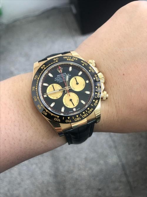 Brand: Rolex Replica Model: Daytona Replica Model Number: 116518 Gender: Men's Case Case Shape: Round Case Diameter: 40 mm Case Color: Yellow Gold Case Material: Stainless Steel Bezel Color: Yellow Gold Bezel Material: Stainless Steel Bezel: Smooth Winding Crown: Screw-down, Triplock triple waterproofness system Crystal: Scratch Resistant Sapphire Case Back: Solid Dial Dial Color: Black & Champagne Dial Dial Markers: Index Dial Type: Analog Hands: Luminous Bracelet Band Material: Alligator Strap Band Color: Black Clasp: Rolex Folding Oysterclasp Movement Movement: Automatic, Swiss, Top Swiss Precision: Deviation: Asian (± 30 - 60 sec/day), Swiss (± 15 - 30 sec/day), 1:1 Clone (± 2 - 5 sec/day) Power reserve: Approximately 72 hours Functions: Hours, Minutes, Seconds, Stop-Seconds For Precise Time Setting, Chronometer Oscillator: Paramagnetic blue Parachrom hairspring. High-performance Paraflex shock absorbers Winding: Bidirectional self-winding via Perpetual rotor Additional Info Water Resistance: Asian:life waterproof, Swiss: 100 meters, Top: 300 m After-sales service Warranty: Asian: 1 Year, Swiss: 2 Years, 1:1 Clone: 5 Years Return Policy: If you are not satisfied with our product, please return your watch within 30 days for a full refund. See our return policy for details. Description