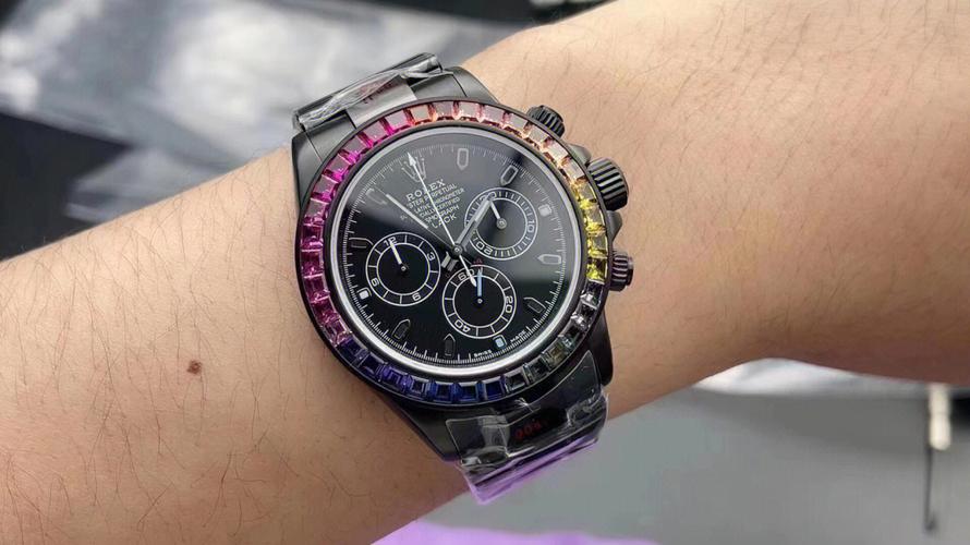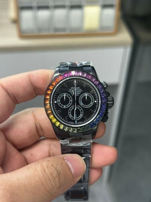 The Rainbow Daytona 116520 DLC-PVD represents a mechanical rainbow design inspired by the Victorian era. The 40mm case undergoes the same blackening treatment as antique firearms and features microscopic brush lines across its surface. The bezel features 36 synthetic gradient gems which rest on brass bases and produce a warm light halo when illuminated similar to London gas lamps from the 1880s. The dome-shaped sapphire glass enables you to see the precise transmission system of the improved 4130 movement which resembles an old steam locomotive. The chronograph button features a Victorian pocket watch-inspired snail design which produces a satisfying mechanical sound when activated. This timepiece functions as a dual-purpose token that unites Industrial Revolution mechanical design with contemporary watchmaking engineering. The dial's rainbow scales reflect a retro spectrum when morning light passes through them in a way that resembles an old prism.