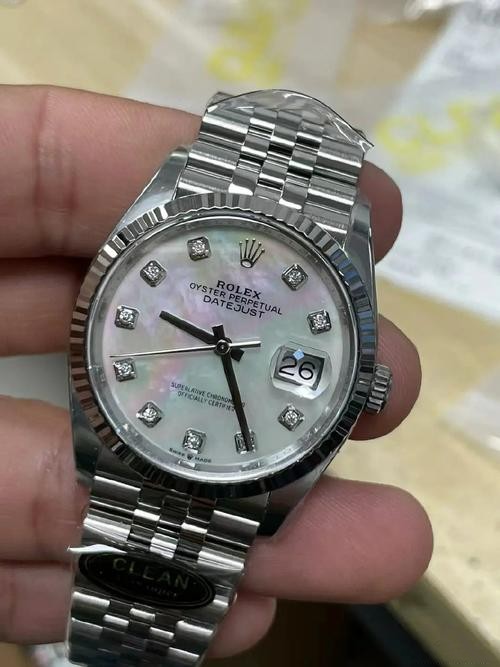 Rolex Datejust 126234 White Mother of Pearl Diamonds Dial 36MM Unisex Replica Watch features a 36mm stainless steel case, Polished solid white gold fluted fixed bezel ,White Mother of Pearl dial with diamond hour markers. Date window displayed under cyclops lens at 3 o'clock with instantaneous date setting.Jubilee bracelet with five-piece links, folding Oysterclasp buckle with Easylink comfort extension link.