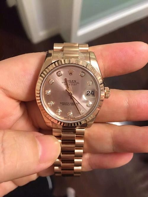 Rolex Datejust 178275 Rose Gold Pink Diamond Dial 31mm Lady Replica Watch , has a 31mm Everose gold Case and fluted bezel, Pink Dial with Diamond Hour Markers,Date window displayed at the 3 o'clock position with a cyclops magnifying lens.Scratch Resistant Sapphire Crystal,Everose Gold Presidential Bracelet with Adjustable Bracelet Deployment Buckle. -