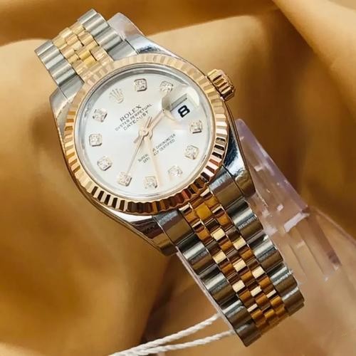 Rolex Datejust 179173 White Diamond Dial Fluted Bezel 26MM Lady Replica Watch,Stainless steel oyster case 26.0 mm in diameter.Yellow gold fluted bezel. Scratch resistant sapphire crystal with cyclops magnifier.White Dial with Diamond Hour Markers.Date calendar at 3 o'clock aperture. Stainless steel yellow gold jubilee bracelet with a hidden clasp.