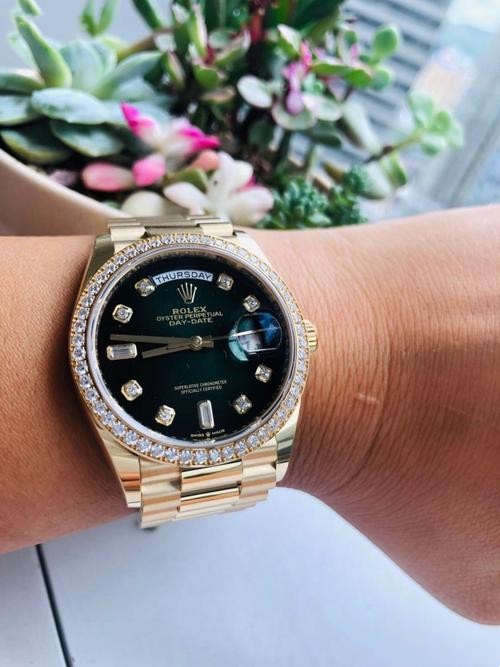 This watch SLAPS! Seriously, it's a total head-turner. The green and gold combo is fire, and the diamonds add just the right amount of bling.