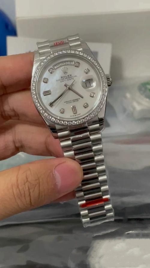 Brand: Rolex Replica Model: Day Date Replica Model Number: 128349RBR 0004 Gender: Lady Case Case Shape: Round Case Diameter: 36 MM Case Color: Silver Case Material: Stainless Steel Bezel Color: Silver Bezel Material: Stainless Steel Set With Diamonds Bezel: Fluted Winding Crown: Screw-down, Triplock triple waterproofness system Crystal: Scratch Resistant Sapphire Case Back: Solid Dial Dial: White Mother of Pearl Dial Dial Markers: Diamond Dial Type: Analog Bracelet Band Material: Stainless Steel Band Color: Silver Band Name: President, semi-circular three-piece links Clasp: Rolex Folding Oysterclasp Movement Movement: Automatic, Swiss, Top Swiss Precision: Deviation: Asian (± 30 - 60 sec/day), Swiss (± 15 - 30 sec/day), 1:1 Clone (± 2 - 5 sec/day) Power reserve: Approximately 72 hours Functions: Hours, Minutes, Seconds, Instantaneous Date With Rapid Setting, Stop-Seconds For Precise Time Setting, Chronometer Oscillator: Paramagnetic blue Parachrom hairspring. High-performance Paraflex shock absorbers Winding: Screw-down, Twinlock double waterproofness system Additional Info Water Resistance: Asian:life waterproof, Swiss: 100 meters, Top: 300 m After-sales service Warranty: Asian: 1 Year, Swiss: 2 Years, 1:1 Clone: 5 Years Return Policy: If you are not satisfied with our product, please return your watch within 30 days for a full refund. See our return policy for details. -