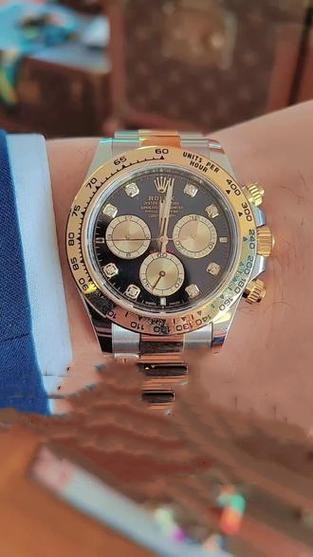 The pinnacle collision of racing legends and jewelry craftsmanship, this two-color Daytona 126503 replica watch pushes Rolex's competitive genes to a new level of luxury - the 40mm stainless steel and 18K rose gold case uses multi-layer PVD coating technology to present a two-color gradient effect that is exactly the same as the original. The 36 top black diamonds inlaid on the matte black dial use the patented "stardust positioning" process, and the cut surface of each diamond forms a perfect halo with the timing circle. Equipped with a replica 4131 chronograph movement, the column wheel structure and the vertical clutch operation feel perfectly replicate the original silky touch, and the rose gold scale of the Cerachrom ceramic outer ring uses molecular-level deposition technology, and its wear resistance reaches sapphire level. From New York's financial district to Las Vegas' VIP box, this "Dark Night Meteor" can show your kingly aura. The anti-counterfeiting code on the inside of the lugs and the micro-carving patterns on the movement's oscillating weight are so exquisite that even the appraisal experts at Antiquorum Auction House need professional equipment to distinguish the quality of the replica. It can be called "the ultimate combination of racetrack aesthetics and jewelry craftsmanship."