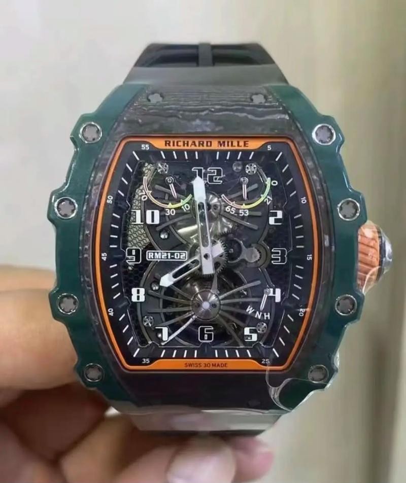 Customer Reviews Cust********F80  2025-06-18 Cust********F80  2025-06-18I'm blown away by the Richard Mille RM 21-02! The tourbillon movement is a work of art. The lightweight feel of the TPT carbon is incredible, you barely feel it on your wrist. And the green titanium case? Absolutely stunning! I can't stop staring at it. Best purchase I've made in a long time. This watch is absolutely fire!  Bra******and  2025-05-13 Bra******and  2025-05-13The RM 21-02 is pretty cool. I dig the green titanium case; it's something different. The rubber strap is comfortable for everyday wear. Only thing is, it's a bit too flashy for some occasions. Overall, a solid timepiece. I'm generally happy, although it does draw a lot of attention. It's a head-turner for sure!  Devo********eler  2025-04-13 Devo********eler  2025-04-13Just got my Richard Mille RM 21-02. This thing is insane! The skeleton dial is mesmerizing, and the carbon case feels super lightweight yet solid. Definitely a statement piece. Worth every penny! I feel like a boss wearing this! #RichardMille #Tourbillon #LuxuryWatch    Pan*******aron  2024-05-10 Pan*******aron  2024-05-10Wow! What a watch.. I get many compliments from my friends and clients.Great site, service and most important Quality!!!