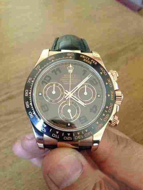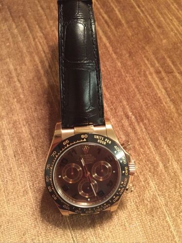 Brand: Rolex Replica Model: Daytona Replica Model Number: 116515LN Gender: Men's Case Case Shape: Round Case Diameter: 40 mm Case Color: Rose Gold Case Material: Stainless Steel Bezel Color: Black Bezel Material: Ceramic Bezel: Smooth Winding Crown: Screw-down, Triplock triple waterproofness system Crystal: Scratch Resistant Sapphire Case Back: Solid Dial Dial Color: Chocolate Dial Dial Markers: Arabic Dial Type: Analog Hands: Luminous Bracelet Band Material: Rubber Strap Band Color: Black Clasp: Rolex Folding Oysterclasp Movement Movement: Automatic, Swiss, Top Swiss Precision: Deviation: Asian (± 30 - 60 sec/day), Swiss (± 15 - 30 sec/day), 1:1 Clone (± 2 - 5 sec/day) Power reserve: Approximately 72 hours Functions: Hours, Minutes, Seconds, Stop-Seconds For Precise Time Setting, Chronometer Oscillator: Paramagnetic blue Parachrom hairspring. High-performance Paraflex shock absorbers Winding: Bidirectional self-winding via Perpetual rotor Additional Info Water Resistance: Asian:life waterproof, Swiss: 100 meters, Top: 300 m After-sales service Warranty: Asian: 1 Year, Swiss: 2 Years, 1:1 Clone: 5 Years Return Policy: If you are not satisfied with our product, please return your watch within 30 days for a full refund. See our return policy for details. -