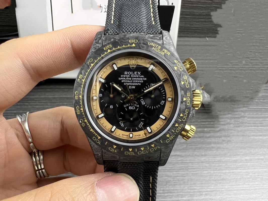 This Rolex Daytona DiW Essence Carbon Fiber Luminous Limited Edition is truly a standout piece. The carbon fiber dial is a work of art, with intricate patterns and a stunning finish. The luminous elements are perfectly integrated, providing excellent visibility in the dark. The watch is comfortable to wear, with a perfect fit and a lightweight feel. The craftsmanship is top-notch, and every detail is meticulously executed. I'm extremely satisfied with my purchase and would highly recommend this watch to anyone who appreciates fine timepieces.