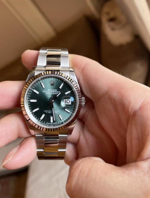 Absolutely stunning watch! The white gold case and mint green dial are a perfect match. It looks amazing on my wrist.