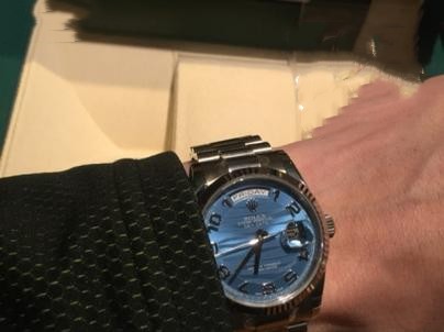 Rolex Day-Date 218239 Wave Blue Dial White Gold 41MM Mens Replica Watch, has a 41mm White gold case that has a solid case back,a screw-down crown, and a fluted white gold bezel.Scratch resistant sapphire crystal with Cyclops magnifier.Wave Blue Dial with Arabic Numerals Hour Markers,Date Window Displayed at 3 O'Clock,Day Window Displayed at 12 O'Clock,White gold three-piece-link Presidential bracelet with a fold-over clasp.