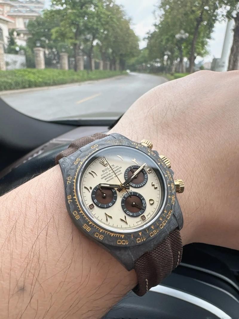 Brand: Rolex Replica Model: Daytona Replica Model Number: Customized Gender: Men's Case Case Shape: Round Case Diameter: 40 mm Case Color: Black Case Material: Carbon Fiber Bezel Color: Black Bezel Material: Carbon Fiber Bezel: Smooth Winding Crown: Screw-down, Triplock triple waterproofness system Crystal: Scratch Resistant Sapphire Case Back: Solid Dial Dial Color: Cream & Brown Dial Dial Markers: Arabic Hands: Luminous Dial Type: Analog Bracelet Band Material: Nylon Strap Band Color: Brown Clasp: Rolex Folding Oysterclasp Movement Movement: Automatic, Swiss, Top Swiss Precision: Deviation: Asian (± 30 - 60 sec/day), Swiss (± 15 - 30 sec/day), 1:1 Clone (± 2 - 5 sec/day) Power reserve: Approximately 72 hours Functions: Hours, Minutes, Seconds, Stop-Seconds For Precise Time Setting, Chronometer Oscillator: Paramagnetic blue Parachrom hairspring. High-performance Paraflex shock absorbers Winding: Bidirectional self-winding via Perpetual rotor Additional Info Water Resistance: Asian:life waterproof, Swiss: 100 meters, Top: 300 m After-sales service Warranty: Asian: 1 Year, Swiss: 2 Years, 1:1 Clone: 5 Years Return Policy: If you are not satisfied with our product, please return your watch within 30 days for a full refund. See our return policy for details. -