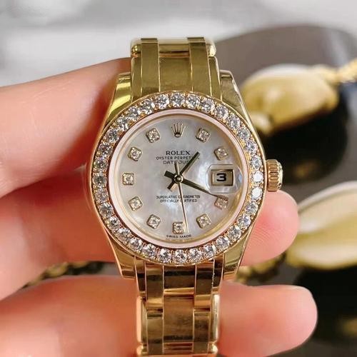 Rolex Pearlmaster 80298 White MOP Dial 29MM Lady Replica Watch,Features 29mm a polished solid yellow gold round case and Pearlmaster bracelet. Polished solid yellow gold fixed bezel set with diamonds. White Mother of Pearl dial with diamond hour markers. Date displayed under cyclops lens in window at 3 o'clock with instantaneous date setting. A scratch resistant sapphire crystal protects the dial. Screw down crown. Polished solid yellow gold deployment buckle.