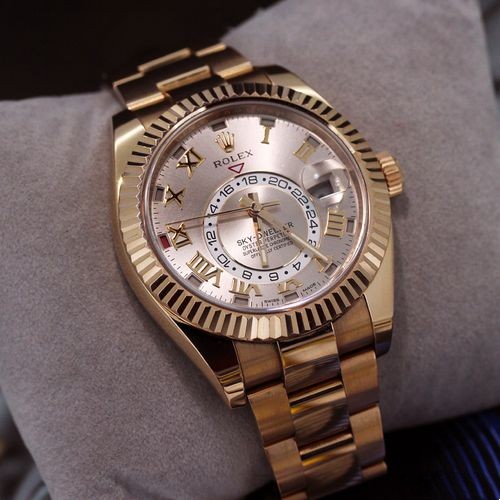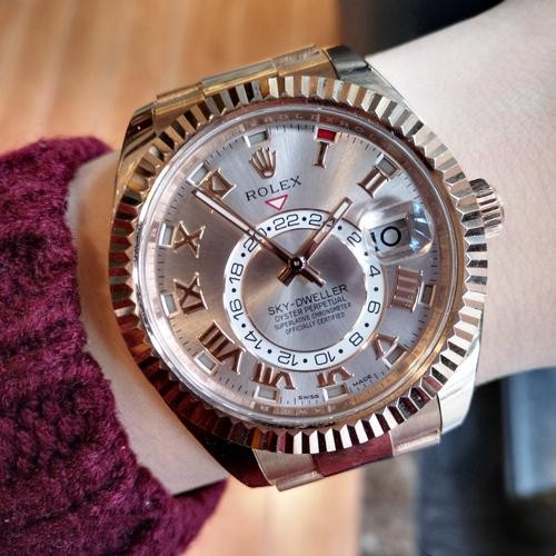 Rolex Sky-Dweller 326935 Sundust Roman Numeral Dial 42mm Mens Replica Watch , 42mm rose gold case in diameter.Sundust dial with luminous hands and Roman numeral hour markers. Minute markers around the outer rim. It is surrounded by the signature rose gold fluted Bi-directional rotating bezel.The date is displayed at 3 o'clock under a classic Cyclops lens.A rose gold oyster bracelet with three-piece links and folding-clasp.