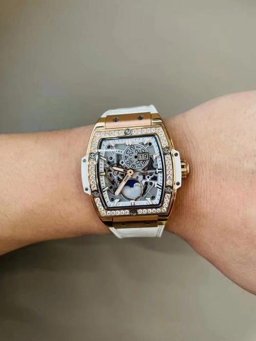This 42mm tonneau chronograph features a bold skeleton dial, a pavé-style diamond bezel look, and a clean white sport strap. Built for collectors who want the Spirit of Big Bang wrist presence with an eye-catching, modern luxury-sport finish.