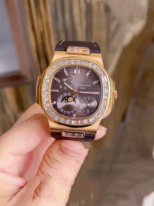 Brand: Patek Philippe Replica Model: Nautilus 5724/001 Model Number: 5724/001 Gender: Men's Case Case Shape: Octagonal Case Diameter: 40 mm Case Thickness: 11.5 mm Case Material: 18k Rose Gold Case Finish: Polished Bezel Type: Fixed with Diamond Accents Bezel Material: 18k Rose Gold & Diamonds Crown Type: Screw-down Crystal: Scratch Resistant Sapphire Case Back: Exhibition Caseback Water Resistance: 50 meters Dial Dial Color: Black Dial Finish: Sunburst with Guilloché Texture Hour Markers: Applied Rose Gold Indices Hands: Rose Gold Dauphine Hands Date Display: At 3 o’clock Lume: Super-LumiNova Blue Moonphase: At 6 o'clock Position Bracelet Bracelet Type: Alligator Leather Strap Bracelet Material: Brown Alligator Leather Bracelet Finish: Polished and Smooth Bracelet Color: Brown Clasp: Deployant Clasp with Patek Philippe Logo Band Width: 22 mm Movement Movement Type: Automatic Caliber: Caliber 324 S C Jewels: 29 Vibrations Per Hour: 28,800 vph Accuracy: ±3 to 5 seconds/day Power Reserve: 45 Hours Functions: Hours, Minutes, Seconds, Date, Moonphase Additional Details Warranty: 2 Years Packaging: Luxury Watch Box, Manual, Certificate of Authenticity Return Policy: If not satisfied, return within 30 days for a full refund. See our return policy for details. -