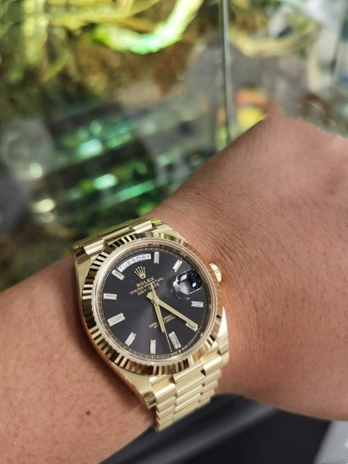 Rolex Day-Date 228238 Black Diamond Dial Fluted Bezel 40mm Mens Replica Watch, featuring a 40mm Yellow Gold case, solid case back with screw-down crown and fluted bezel. Scratch-resistant sapphire crystal with Cyclops magnifying glass.Black Dial with 10 Baguette-Cut Diamond Hour Markers, date window at 3 o'clock, day of the week window at 12 o'clock,Yellow Gold three-piece presidential bracelet with deployant clasp.