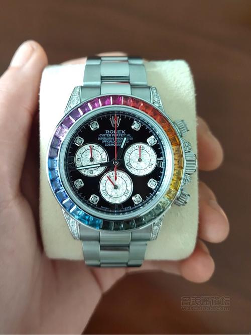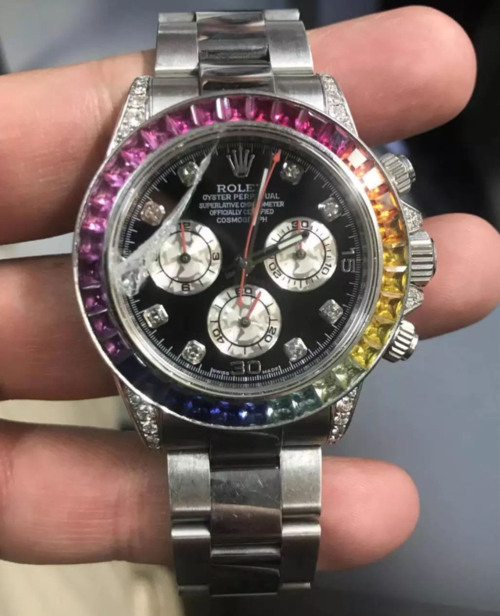 This Daytona is a masterpiece. The white gold case feels premium, and the rainbow bezel catches light beautifully.