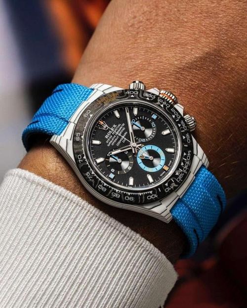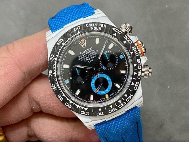 Brand: Rolex Replica Model: Daytona Replica Model Number: 116500 Gender: Men's Case Case Shape: Round Case Diameter: 40 mm Case Color: White Case Material: Carbon Fiber Bezel Color: Black Bezel Material: Carbon Fiber Bezel: Smooth Winding Crown: Screw-down, Triplock triple waterproofness system Crystal: Scratch Resistant Sapphire Case Back: Solid Dial Dial Color: Black & Blue Counter Rings Dial Dial Markers: Index Dial Type: Analog Hands: Luminous Bracelet Band Material: Nylon Strap Band Color: Blue Clasp: Rolex Folding Oysterclasp Movement Movement: Automatic, Swiss, Top Swiss Precision: Deviation: Asian (± 30 - 60 sec/day), Swiss (± 15 - 30 sec/day), 1:1 Clone (± 2 - 5 sec/day) Power reserve: Approximately 72 hours Functions: Hours, Minutes, Seconds, Stop-Seconds For Precise Time Setting, Chronometer Oscillator: Paramagnetic blue Parachrom hairspring. High-performance Paraflex shock absorbers Winding: Bidirectional self-winding via Perpetual rotor Additional Info Water Resistance: Asian:life waterproof, Swiss: 100 meters, Top: 300 m After-sales service Warranty: Asian: 1 Year, Swiss: 2 Years, 1:1 Clone: 5 Years Return Policy: If you are not satisfied with our product, please return your watch within 30 days for a full refund. See our return policy for details. -