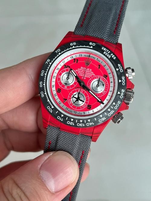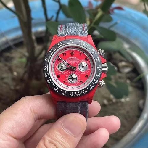 Brand: Rolex Replica Model: Daytona Replica Model Number: Customised Gender: Men's Case Case Shape: Round Case Diameter: 40 mm Case Color: Red Case Material: Quartz Fibre Bezel Color: Black Bezel Material: Carbon Fiber Bezel: Smooth Winding Crown: Screw-down, Triplock triple waterproofness system Crystal: Scratch Resistant Sapphire Case Back: Solid Dial Dial Color: Red and White Dial Dial Markers: Index Hands: Luminous Dial Type: Analog Bracelet Band Material: Nylon Strap Band Color: Black Clasp: Rolex Folding Oysterclasp Movement Movement: Automatic, Swiss, Top Swiss Precision: Deviation: Asian (± 30 - 60 sec/day), Swiss (± 15 - 30 sec/day), 1:1 Clone (± 2 - 5 sec/day) Power reserve: Approximately 72 hours Functions: Hours, Minutes, Seconds, Stop-Seconds For Precise Time Setting, Chronometer Oscillator: Paramagnetic blue Parachrom hairspring. High-performance Paraflex shock absorbers Winding: Bidirectional self-winding via Perpetual rotor Additional Info Water Resistance: Asian:life waterproof, Swiss: 100 meters, Top: 300 m After-sales service Warranty: Asian: 1 Year, Swiss: 2 Years, 1:1 Clone: 5 Years Return Policy: If you are not satisfied with our product, please return your watch within 30 days for a full refund. See our return policy for details. -