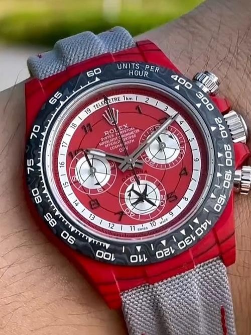 I've always been a fan of Rolex, but this Daytona takes it to another level. The custom red and white dial is eye-catching and the carbon fiber bezel adds a sporty touch. It's perfect for both casual and formal occasions.