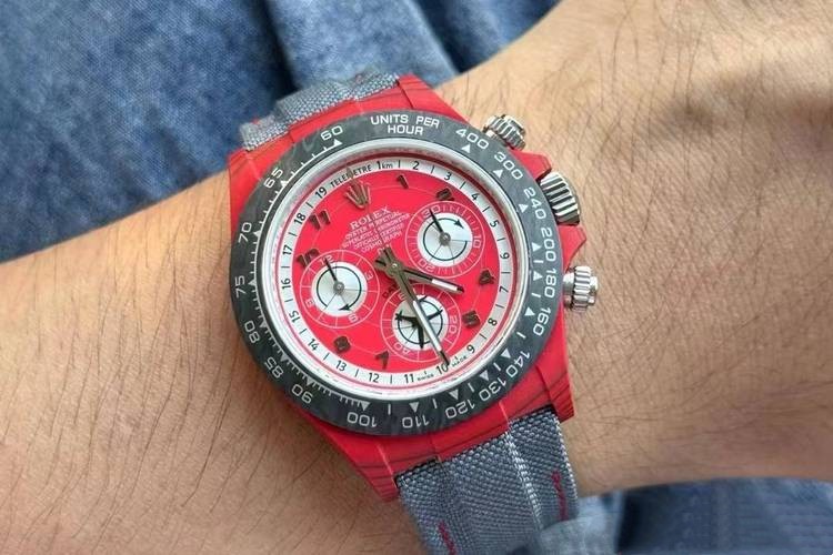 This Rolex Daytona is a game-changer. The custom red and white dial is so unique and eye-catching. The carbon fiber bezel adds a sporty touch while maintaining the elegance of a Rolex. The 40mm size fits perfectly on my wrist and the watch feels incredibly comfortable.