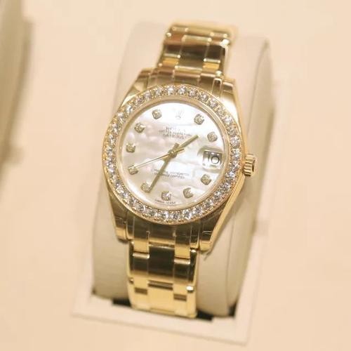 Rolex Pearlmaster 80298 White MOP Dial 29MM Lady Replica Watch,Features 29mm a polished solid yellow gold round case and Pearlmaster bracelet. Polished solid yellow gold fixed bezel set with diamonds. White Mother of Pearl dial with diamond hour markers. Date displayed under cyclops lens in window at 3 o'clock with instantaneous date setting. A scratch resistant sapphire crystal protects the dial. Screw down crown. Polished solid yellow gold deployment buckle.